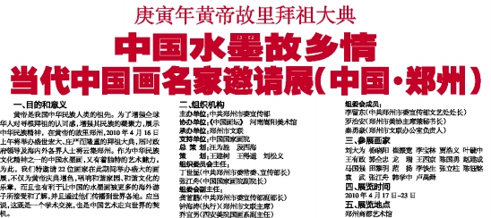 黄帝是我国中华民族人类的祖先。为了增强全球华人对寻根拜祖的认同感,增强其民族的凝聚力,展示中华民族精神,在黄帝的故里郑州,2010年4月16日上午将举办盛世宏大、庄严而隆重的拜祖大典,届时政府领导及海内外各界人士将云集郑州。作为中华民族文化精神之一的中国水墨画,又有着独特的艺术魅力。为此,我们特邀请22位画家在此期间举办盛大的画展,不仅为黄帝庆典增色,唱响和谐家园、和谐文化的乐章,而且也有利于让中国的水墨画被更多的海外游子所接受和了解,并且通过他们传播到世界各地。应当说,这既是一个学术交流,也是中国艺术走向世界的契机。