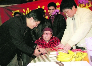 在沙老的客厅中央悬挂着一条“祝沙老新春快乐”的鲜红横幅,给沙老家带来了喜气祥和的氛围。苏州市福临门大家庭食品有限公司为沙老特制了“祝沙老健康长寿”的大蛋糕,表达了广大书法篆刻界人士的共同心愿,恭祝95岁高龄的沙老身体健康,艺术生涯常青。