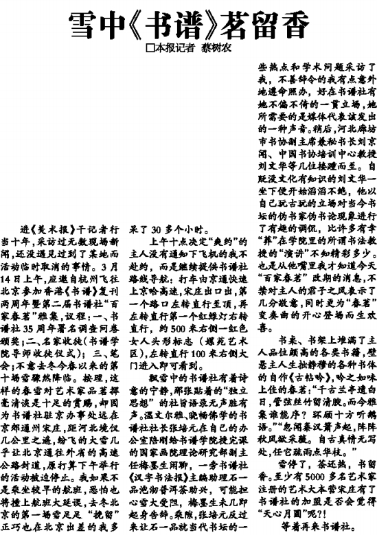进《美术报》干记者行当十年,采访过无数现场新闻,还没遇见过到了某地而活动临时取消的事情。3月14日上午,应邀自杭州飞往北京参加香港《书谱》复刊两周年暨第二届书谱社“百家春茗”雅集,议程:一、书谱社35周年署名调查问卷颁奖;二、名家收徒(书谱学院导师收徒仪式);三、笔会;不意去冬今春以来的第十场雪骤然降临。按理,这样的春雪对艺术家品茗挥毫清谈是十足的赏赐,却因为书谱社驻京办事处远在京郊通州宋庄,距河北境仅几公里之遥,纷飞的大雪几乎让北京通往外省的高速公路封道,原打算下午举行的活动被迫停止。我如果不是乘坐较早的航班,恐怕也将撞上航班大延误,去冬北京的第一场雪足足“挽留”正巧也在北京出差的我多呆了30多个小时。