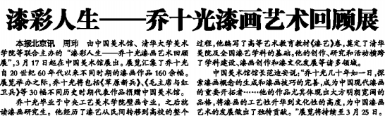 本报北京讯 周玮 由中国美术馆、清华大学美术学院等联合主办的“漆彩人生——乔十光漆画艺术回顾展”,3月17日起在中国美术馆展出。展览汇集了乔十光自20世纪60年代以来不同时期的漆画作品160余幅。展览举办之际,乔十光将包括《草原新兵》、《毛主席与红卫兵》等30幅不同历史时期代表作品捐赠中国美术馆。