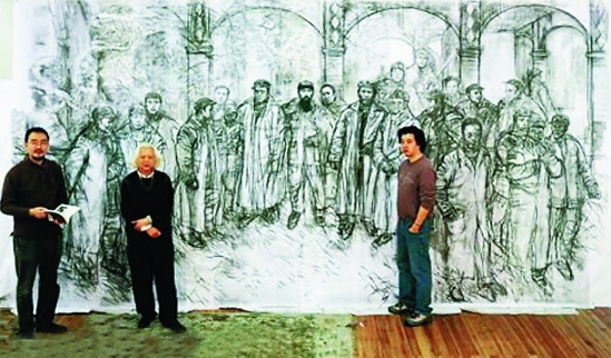吴山明(中)何士扬(左一)、吴扬(右一)与《遵义之春》。