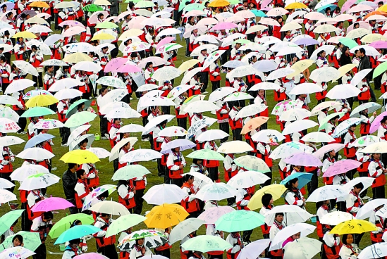 | 3月30日,浙江省上虞市崧厦镇中学的1500多名学生在展示他们绘制的伞画。当日,该校举行“撑起文明小阳伞,共建和谐大家园”主题活动,学生们通过在伞上绘画,倡导文明新风。上虞市崧厦镇有“中国伞城”之称,几乎每家每户都有人从事和伞有关的工作。 新华社 韩坚/摄 |
