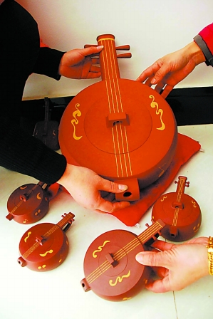 3月29日, 一组仿照乐器制成的音乐系列紫砂壶在江苏省宜兴紫砂工艺厂内问世。该作品是宜兴工艺美术师高俭按照乐器系列中的“马头琴、三弦、阮”等量身制作而成,壶面上五线谱中的音符是采用段泥镶钳,溶观赏与趣味性于一体。这组器乐紫砂壶共分五件,小壶可溶水200毫升,大壶按照乐器中的“阮”1:1仿实创作,可溶水约5公斤。这组作品富有现代陶艺色彩和时尚气息,极具观赏性。闵学平摄