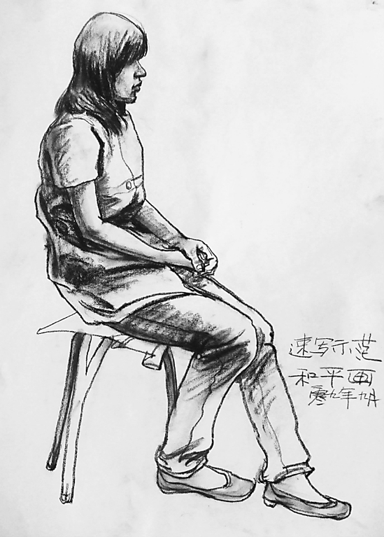 这是一幅线面结合的速写。画这类速写时要注意用线造型,用面来丰富画面,增强体积感,但是不要像画素描那样去处理“面”,要根据画面的需要灵活处理。