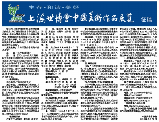 2010年上海世博会已经成为世界瞩目的焦点,为了更好地弘扬中华民族的文化精神,推进中国美术界提出的熔铸中国气派、塑造国家形象的发展目标,为上海世博会增光添彩,经上海世博会立项,由中国美术家协会独家主办“上海世博会中国美术作品展览”。