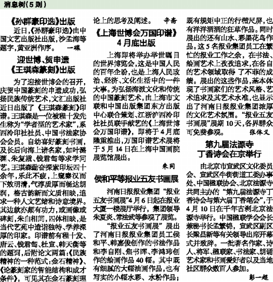 “报业五友书画展”展出了河南日报报业集团员工侯和平、韩嘉俊创作的书法作品和李自刚、焦书晖、李鸿玮创作的绘画作品40幅。其中既有细腻的大幅油画作品,也有写实的小幅水彩、水粉作品;既有规矩中正的行楷尺屏,也有洋洋洒洒的狂草作品。同时展出的还有山水、彩墨花鸟作品。这5名报业集团员工在繁忙的报业工作之余,在书法、绘画艺术上孜孜追求,在各自的艺术领域取得 了不菲的成绩。展出的这些作品,基本体现了书画家们的艺术风格、艺术追求及其艺术水准,也显示出了河南日报报业集团浓厚的文化艺术氛围。“报业五友书画展”展期10天,各界群众可免费参观。 张体义