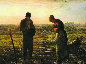 《晚钟》是米勒被世人称为《农民三部曲》的其中之一,是米勒最具代表性的作品。《晚钟》是一幅庄严肃穆的作品。广袤的大地上,一对农民夫妇正在田间劳作,这时远处传来教堂晚祷告的钟声,他们于是停下手中的农活,虔诚地做起了祷告。画家对两人祈祷姿态的形体刻画相当到位,无须细致的面部描写,我们就能够从中感受到这对夫妇忠厚的个性和虔诚的心灵。安详的身影,落日的余晖,遥远的地平线,铲钯、提篮、小推车,一切显得静谧自然。人与自然的和谐统一甚至于观者的情感都融入到了画里,让人有一种莫名的感动。