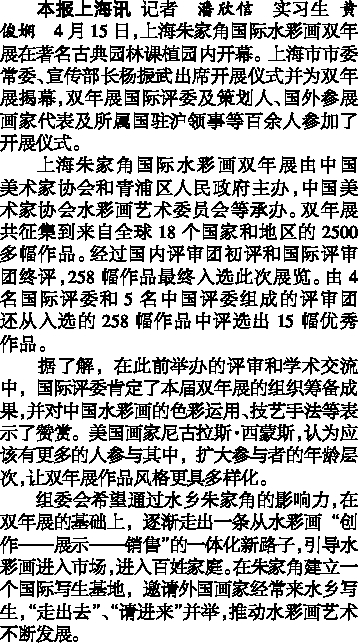 本报上海讯 记者 潘欣信 实习生 黄俊娴 4月15日,上海朱家角国际水彩画双年展在著名古典园林课植园内开幕。上海市市委常委、宣传部长杨振武出席开展仪式并为双年展揭幕,双年展国际评委及策划人、国外参展画家代表及所属国驻沪领事等百余人参加了开展仪式。