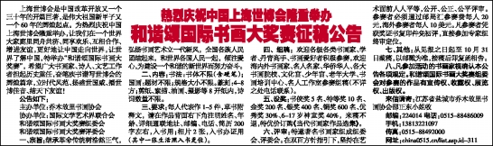 上海世博会是中国改革开放又一个三十年的开篇巨著,是伟大祖国新甲子又一个60年的辉煌起点。为热烈庆祝中国上海世博会隆重举办,让我们在一个世界大家庭里同舟共济、同享欢乐、互相合作、增进友谊,更好地让中国走向世界,让世界了解中国,特举办“和谐颂国际书画大奖赛”, 希望广大书画家、诗人、文艺工作者担起历史重任,奋笔疾书谱写世博会的辉煌篇章,立时代风范、扬盛世国威、播世博佳音、结天下友谊!