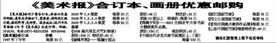 《美术报》拟对少量合订本、画册以优惠价邮购,清单及价格如下。需要者,请邮局汇款订购,款到即寄,免邮资。联系地址:杭州市体育场路178号《美术报》社发行部,邮编:310039。电话:0571-85310358 85100446
