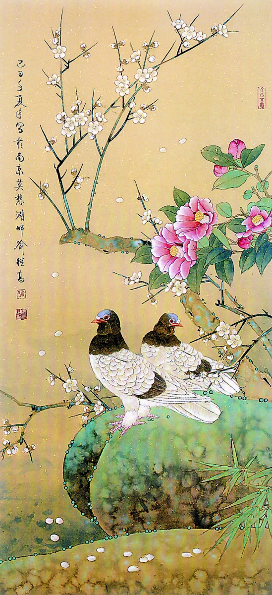 茶梅双鸽 136×68cm 纸本 2009年