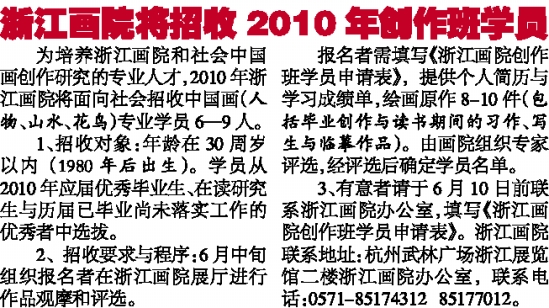 为培养浙江画院和社会中国画创作研究的专业人才,2010年浙江画院将面向社会招收中国画(人物、山水、花鸟)专业学员6—9人。