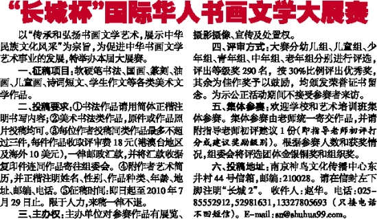 二、投稿要求:①书法作品请用简体正楷注明书写内容;②美术书法类作品,原件或作品照片投稿均可。③每位作者投稿同类作品最多不超过三件,每件作品收取评审费18元(港澳台地区及海外10美元),一律邮政汇款,并将汇款收据复印件连同作品寄往组委会。④附作者艺术简历,并正楷注明姓名、性别、作品种类、年龄、地址、邮编、电话。⑤征稿时间:即日起至2010年7月29日止。限于人力,来稿一律不退。