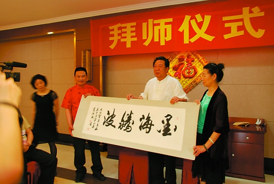 拜师仪式现场葛德瑞老师赠送陈忠明书法“墨海腾波”以此勉励