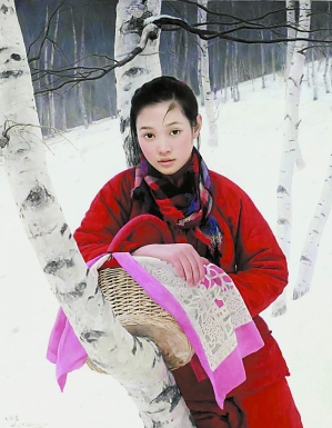 王沂东的许多作品都来自沂蒙山区的一情一景,一人一物,艺术家用严谨的造型、单纯明快的色调展现出一个极富东方神韵的艺术世界。在寂静的旷野中,沂蒙山下的村庄沉静着,蒙昧初开的少女带着原始的温情和寂寞莫名地期待着,而新婚燕尔的少妇在冬日的肃静中憧憬着,它牵动了我们心底深处最朴素的柔情。民间的大红、阳光、静默的黑、美丽的乡村少女是王沂东绘画中反复使用的语言,从这样的集合里我们寻觅到一分乡土的、温情的、宁静的、唯美的感动。时光流逝,在写实技法的探索和深化过程中,王沂东将忧伤渐渐淡去,留下的就是温存与渴望。