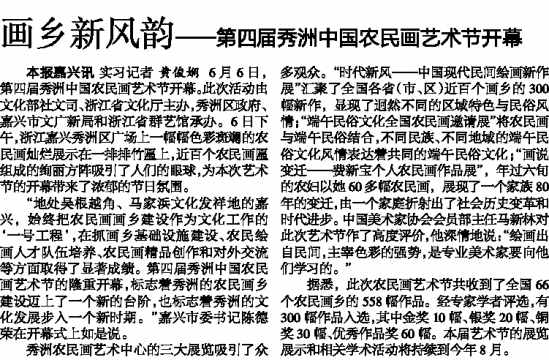 本报嘉兴讯 实习记者 黄俊娴 6月6日,第四届秀洲中国农民画艺术节开幕。此次活动由文化部社文司、浙江省文化厅主办,秀洲区政府、嘉兴市文广新局和浙江省群艺馆承办。6日下午,浙江嘉兴秀洲区广场上一幅幅色彩斑斓的农民画灿烂展示在一排排竹匾上,近百个农民画匾组成的绚丽方阵吸引了人们的眼球,为本次艺术节的开幕带来了浓郁的节日氛围。