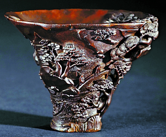清初 文枢款犀角雕山水人物杯
