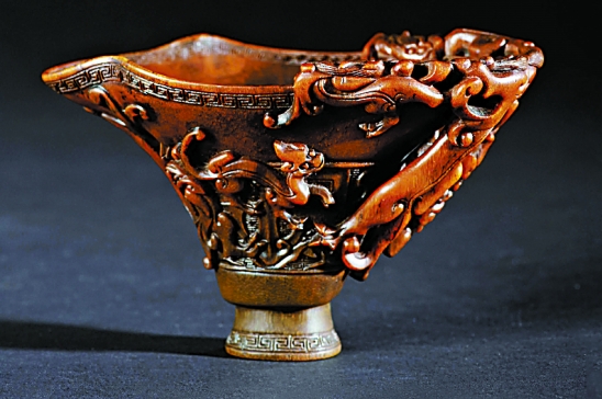 明末 瑞止款螭龙犀角杯 长17.5cm,宽10.6cm,高11.1cm,重341.5g 注:海外藏家提供。 RMB: 1,300,000—1,500,000
