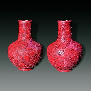 | 清·乾隆 红雕漆山水人物元汉瓶一对 高42cm 口径17cm 足径17cm估价550,000—650,000 |