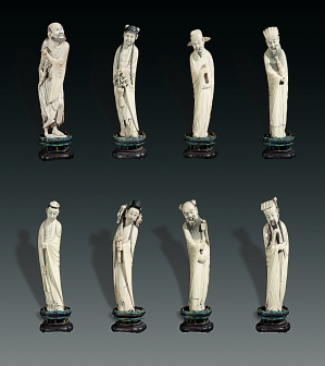 | 清中期 象牙雕八仙像(每件配景泰蓝底座) 高36cm(连座)估价600,000—800,000 |