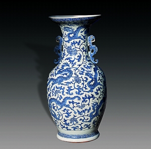 | 清·乾隆 青花香草九龙纹螭耳大瓶 高79cm估价580,000—680,000 |