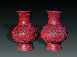 | 明·万历 剔红天球瓶一对 高64cm 宽47cm 估价2,500,000—3,000,000 |