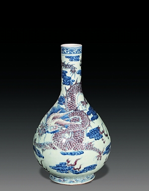 | 清中期 青花釉里红云龙纹瓶 高48cm 宽27cm估价250000—350000 |