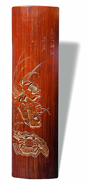 | 清·乾隆(周芷岩) 竹雕荷蟹臂搁 17×7.4cm 估价120000—150000 |