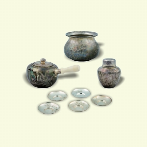 | 明治 纯银梅兰竹菊茶具一套 上:8.5×11.5cm ; 中 左一:8×10.5cm 中 右一:11×8.5cm; 下:直径10cm×5 估价70000—90000 |