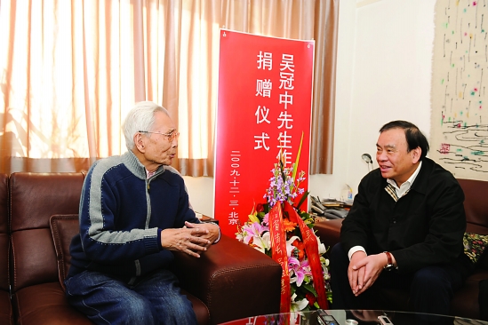 2009年12月3日,吕祖善省长(右一)与吴冠中先生亲切交谈。吕省长说:“吴老,您对浙江的热爱,对母校的热爱,我们表示感谢!”吴老激动地说:“浙江是我艺术的第一故乡。”