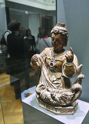 6月24日,在比利时首都布鲁塞尔,观众在“通往亚洲”文物展览上观看印度果阿保留的早期传教士制作的玛格丽特圣母雕像。
