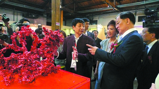 国民党荣誉主席连战(右)观赏熔铜艺术《中国龙,中国红》