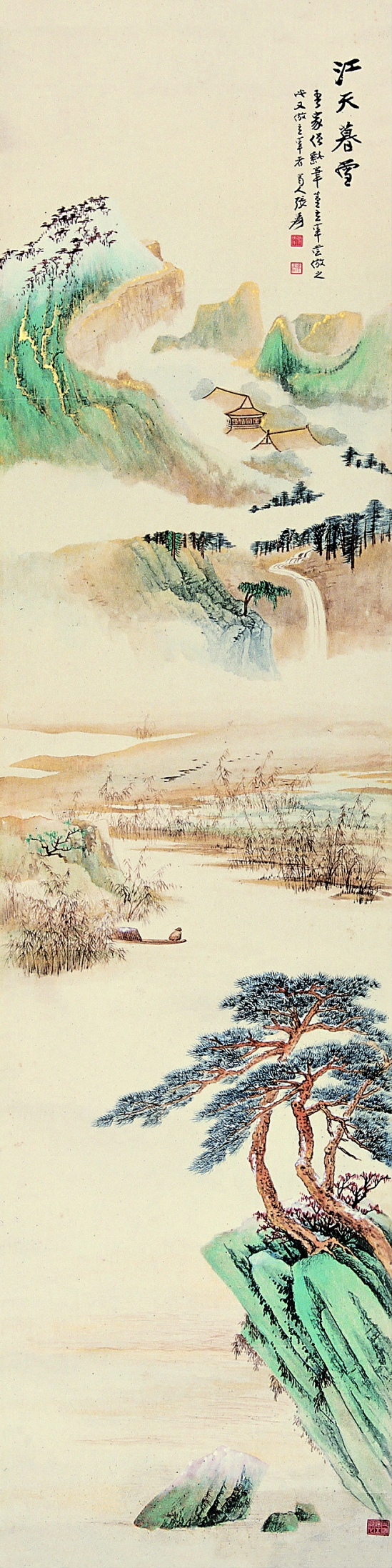 张大千 江天暮雪 勾金设色纸本 镜框 184×47cm