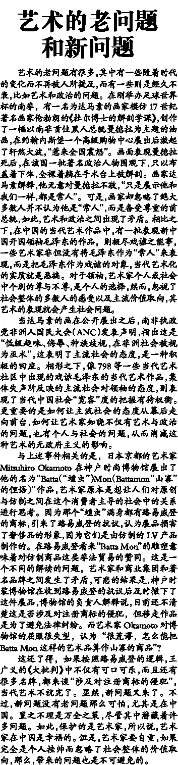 当达马素的画在公开展出之后,南非执政党非洲人国民大会(ANC)发表声明,指出这是“低级趣味、侮辱、种族歧视,在非洲社会被视为巫术”,这表明了主流社会的态度,是一种积极的回应。相形之下,像798等一些当代艺术社区中出现的戏谑毛泽东的当代艺术作品,集体失声所反映的主流社会对领袖的态度,则表现了当代中国社会“宽容”度的把握有待权衡。更重要的是如何让主流社会的态度从幕后走向前台,如何让艺术家知晓不仅有艺术与政治的问题,也有个人与社会的问题,从而消减这种艺术的无政府主义的影响。