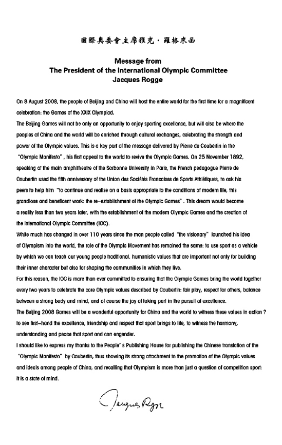 6、萨马兰奇、罗格、何振梁为《奥林匹克宣言》的传播及《奥林匹克(宣言)赋》的创作专门发来了热情洋溢的贺信。