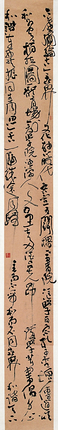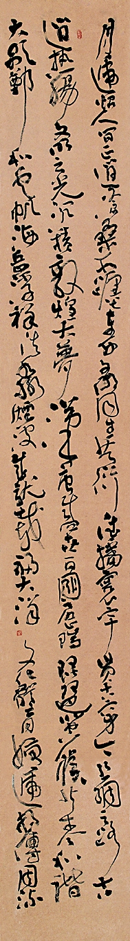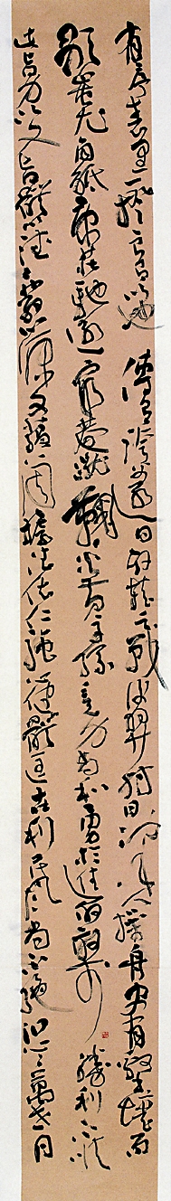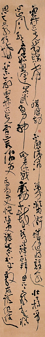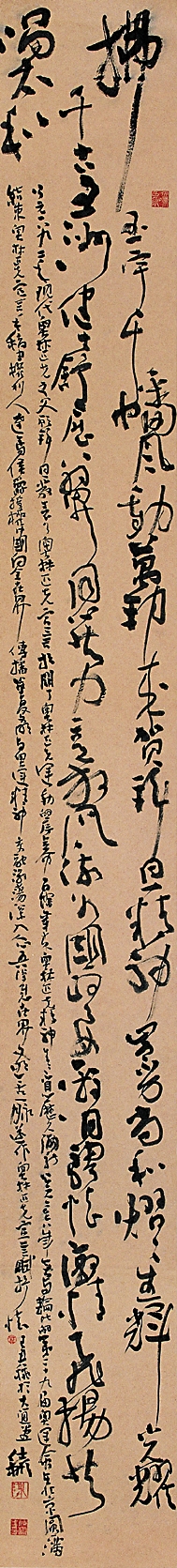 《奥林匹克(宣言)赋》的书法,是陈仕彬在赋的基础上表现的另外一个重要内容,它更体现了作者独有的风神与气韵,体现了那种与赋文相合相生的那种大气与奔逸。给人扑面而来的是那种流动的韵势,那种起伏跌宕的快意,那种咆哮蒸腾的激情,那种一气呵成气吞八荒的气概!它让人脑子里蹦出的是《自叙帖》中的诗句:“奔蛇走虺势入座,骤雨旋风声满堂。”“粉壁长廊数十间,兴来小豁胸中气。忽然绝叫三五声,满壁纵横千万字。”“驰豪骤墨列奔驷,满座失声看不及。”应该说,这件作品从它慢慢地打开,给观者就是这样相当强烈的感受与刺激!它也让人想到了徐渭,可以说,它也是当代的一件《青天歌卷》!