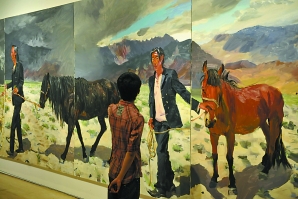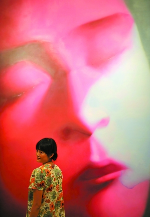 8月18日,一名参观者在布面油画作品《关于睡眠3号》前留影。