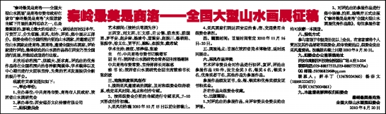“秦岭最美是商洛——全国大型山水画展”是商洛市委市政府在该市“秦岭最美是商洛”大型旅游主题下开展的系列活动之一,也是最重要的、影响力最大的活动之一。该活动历时近半年,斥资百万,分为征稿、采风、创作、评奖、集中展示五部分。组委会将在全国范围内征选山水画家,并邀请近百位山水画家走进商洛、画商洛,邀请全国知名画家、评论家进行评选,最终获选的山水画作品将在西安乃至全国进行巡展,并集结成册进行出版。