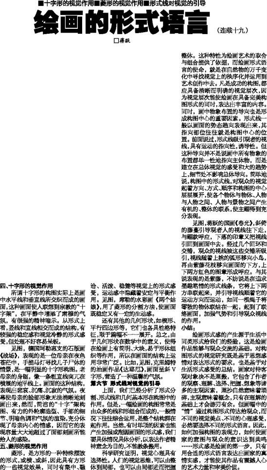 上面,我们已经分析了形式分割、形式线和几何基本形在构图中的作用。但是,一幅绘画的构图常常是由众多的线和形组合而成的,一般情况下往往综合运用,是整个结构群在起作用。当然,有时单项的因素也能产生加强或削弱画面的形式感,我们要具体情况具体分析,以表达作者精神意念为目的,不能教条搬用。
