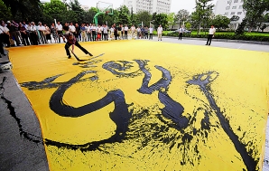 9月5日,在浙江省人民大会堂举行的全省“警民和谐实践创新论坛”上,书法家杨鸿圣应邀在160平方米的丝绸上挥毫书写“警民和谐”巨幅书法,为论坛会助阵,以表达全会精神——警民和谐的美好心愿。