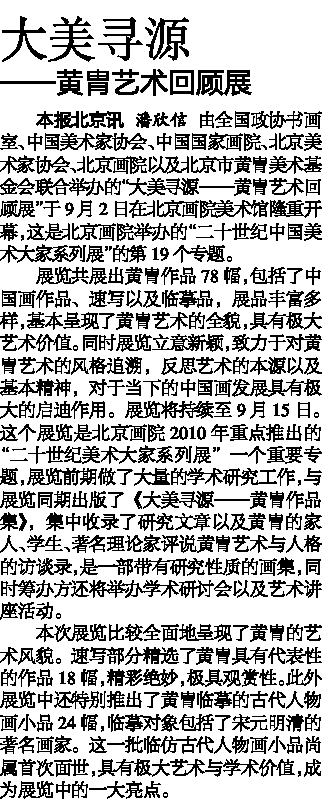 展览共展出黄胄作品78幅,包括了中国画作品、速写以及临摹品,展品丰富多样,基本呈现了黄胄艺术的全貌,具有极大艺术价值。同时展览立意新颖,致力于对黄胄艺术的风格追溯,反思艺术的本源以及基本精神,对于当下的中国画发展具有极大的启迪作用。展览将持续至9月15日。这个展览是北京画院2010年重点推出的“二十世纪美术大家系列展”一个重要专题,展览前期做了大量的学术研究工作,与展览同期出版了《大美寻源——黄胄作品集》,集中收录了研究文章以及黄胄的家人、学生、著名理论家评说黄胄艺术与人格的访谈录,是一部带有研究性质的画集,同时筹办方还将举办学术研讨会以及艺术讲座活动。