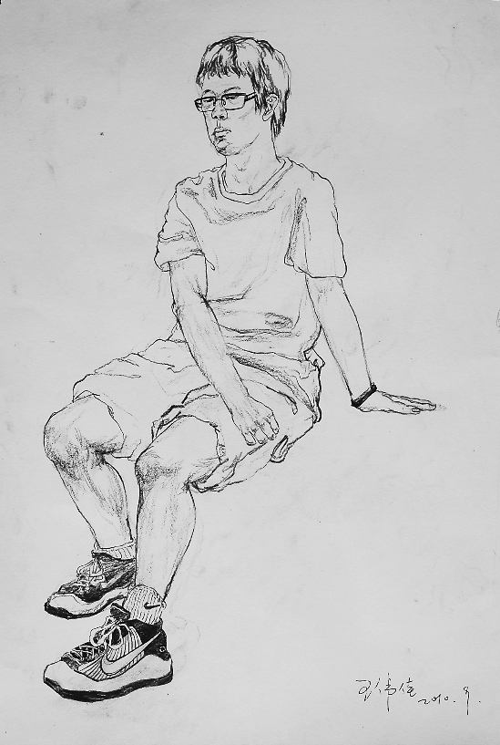 我觉得画速写,头、手及鞋是很重要的,可能很多人一画到这些就头痛,模棱两可不知其确切位置,其实五官及手的关节都应该是肯定和明确的。对于我来说,准确的神态和动态,也得利于高一年段大量的线描练习,所以也要谢谢画室老师精心挑选的白描范本,以前总抱怨线条太繁杂,如今看来确实很有必要。一定的练习,一定的基础,把握好大形及头、手、鞋的细化,再加以流畅的、有虚实轻重的线条,速写一定是画得好的。