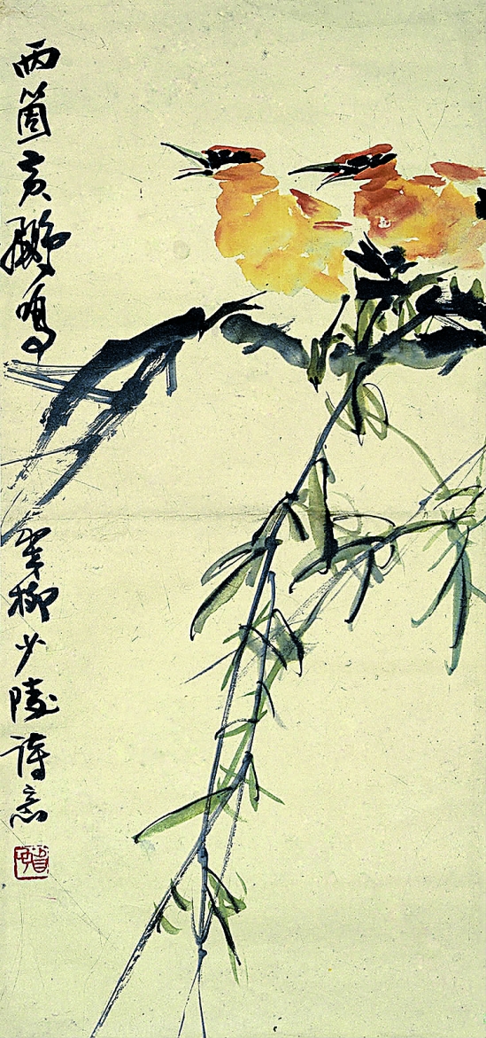 宋省予 两个黄鹂鸣翠柳 30×65cm 1963年