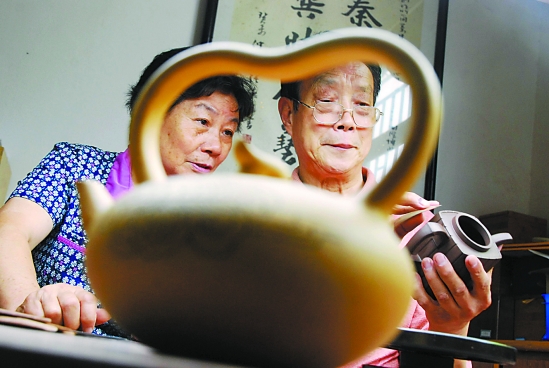 中国工艺美术大师李昌鸿和夫人沈蘧华在一起探讨壶艺