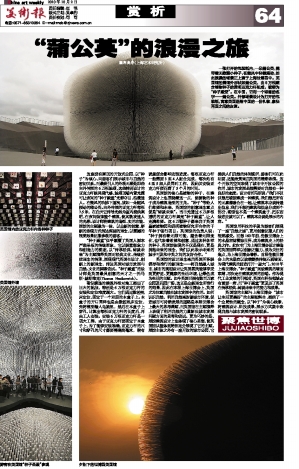 一张打开的包装纸内,一朵蒲公英,携带着无数颗小种子,在微风中轻微摆动,如此浪漫的场景正上演于上海世博园中。英国馆的展馆外形状如蒲公英,由6万根蕴含植物种子的透明亚克力杆组成,被称为“种子殿堂”。在中国,它有一个诗意的名字——蒲公英。外部场景设计为打开的包装纸,寓意英国送给中国的一份礼物,象征两国之间的友谊。