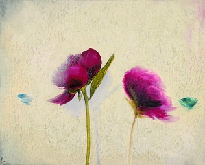 第三:东、西融合,是多少国际知名画家,穷极一生所追求的高标准,却在叶方的斗室中轻易达成,她不像林风眠或丁雄泉最后舍弃油画,而转攻彩墨,因为东方毛笔与宣纸的自由及晕染,实在是油画与画布配合下的“不可能任务”,叶方的油画有东方水墨的留白,极简画面飘出恬淡的生活积累,并不特别强调的油画肌理,却能如水墨的皴法,色彩更是掌握得精准,就是最俗的牡丹花都变成有气质与内涵。