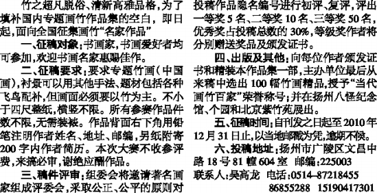 二、征稿要求:要求专题竹画(中国画),衬景可以用其他手法、题材包括各种飞鸟配补,但画面必须要以竹为主。不小于四尺整纸,横竖不限。所有参赛作品件数不限,无需装裱。作品背面右下角用铅笔注明作者姓名、地址、邮编,另纸附寄200字内作者简历。本次大赛不收参评费,来搞必审,谢绝应酬作品。