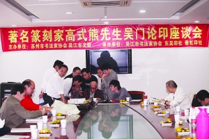 活动当天,主办单位苏州市书法家协会、吴江市文学艺术界联合会还举办了“著名篆刻家高式熊先生吴门论印座谈会”。席间高老开怀纵论篆刻艺术,并一一点评了吴门中青年篆刻同仁的新作,活动自始至终洋溢着和谐的氛围,为这个国庆长假增添了艺术光彩。
