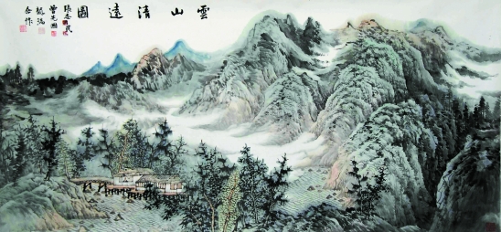 “水墨齐鲁——当代山东代表性画家作品展”祝贺作品 龙瑞 张志民 曾先国 合作 云山清远图 120×240cm 纸本水墨 中国画 2010年
