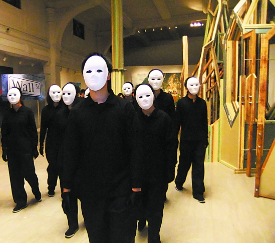 邱志杰作品里头戴面具的黑衣人穿梭在展馆的各个角落,